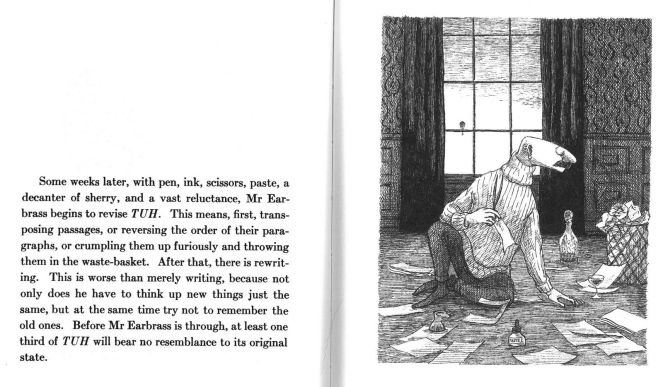 But this doesn’t mean the process is neat or quick. In The Unstrung Harp, Mr. Earbass literally sets to his manuscript with “pen, ink, scissors, paste, a decanter of sherry, and a vast reluctance.”