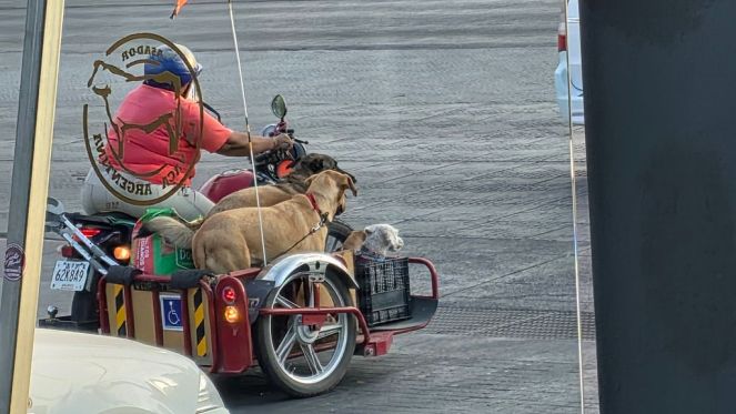 “Um, so did I show you this photo of a lady in Puerto Vallarta who has a sidecar for all her dogs? Badass tia incarnate!”