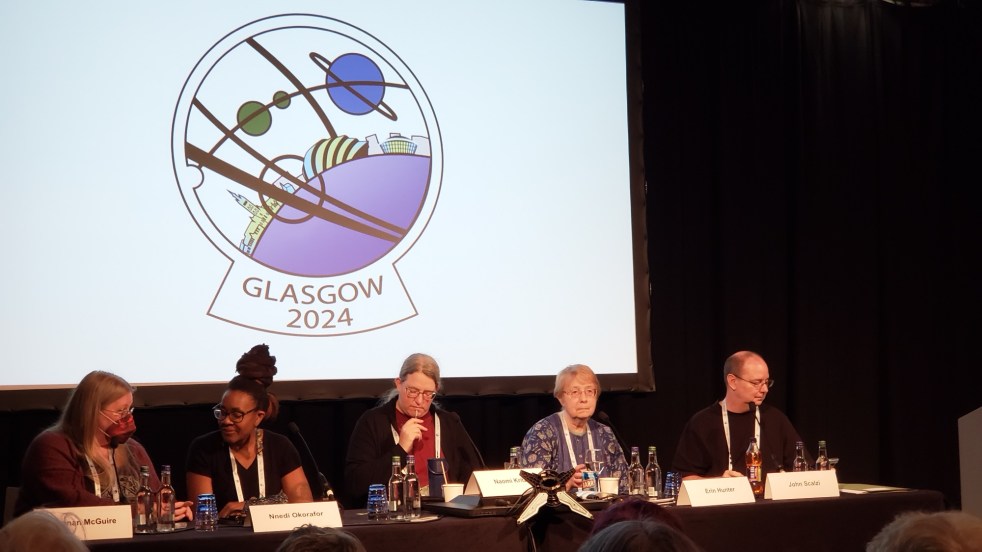 Just a brief note: We are back from Scotland. This was a combination trip - one to celebrate my wife and I reaching birthdays that end with zero, and one to attend Glasgow 2024's World SFF Convention. Pictured here: (L-> R) Seanan McGuire, Nnedi Okorafor, Naomi Kritzer, Erin Hunter, and John Scalzi discussing their cats.)… Continue reading Back from a Big Country